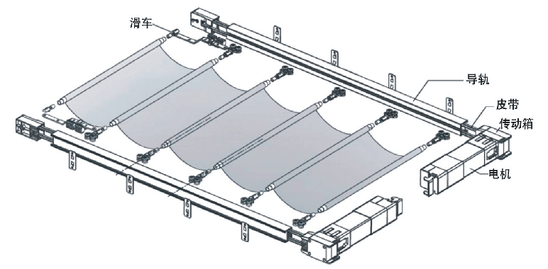 3、采用履帶傳動方式,電機轉速相同,保證天棚簾的開合同步