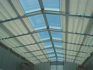 5、天棚簾展開後呈現均勻的波浪式或平麵式效果,運行方式上可采用單開或雙開