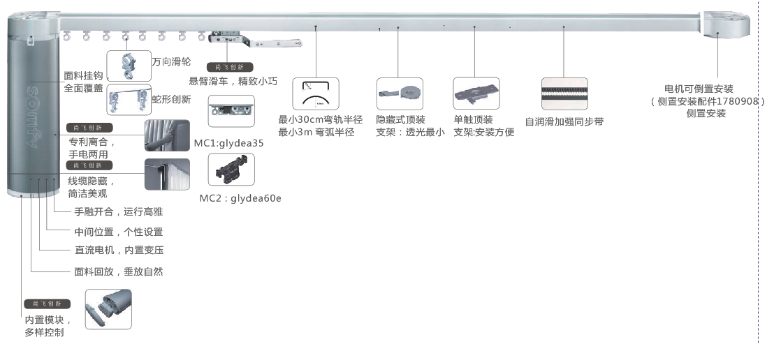 ●開合簾軌道長度極限為12米內,布料<50kg,當長度接近12米或超出12米,應適當考慮使用雙電機結構。< font="">要求設計、訂貨時保守計算,絕不可過載。